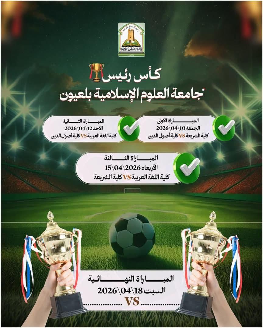 3. المباراة الثالثة: كلية اللغة العربية VS كلية الشريعة الأربعاء 15 إبريل 2026